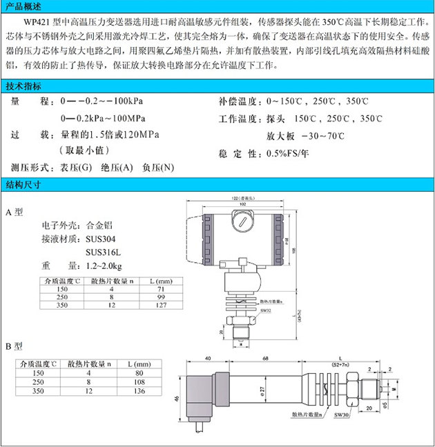 wp421型中高溫壓力變送器選用進Kou耐高溫敏感元件組裝,傳感器探頭能在350C高溫下長期穩定工作。
